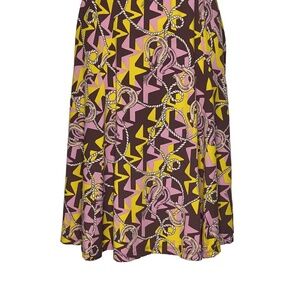 Beautiful sleeveless knit dress by M MISSONI, featuring an eye-catching equestrian-inspired print with horseshoes and rope motifs in maroon, yellow, lavender, and pink tones. Made from a lightweight stretch knit rayon blend, this dress has a comfortable elastic waist and an elegant A-line silhouette that flatters the figure.