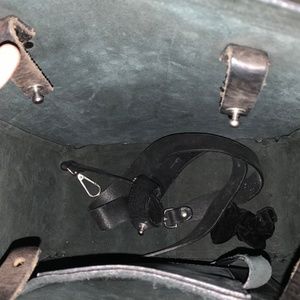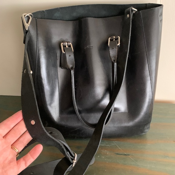 M0851 black leather tote. Structured leather tote with crossbody strap. Clips to close the top (no zipper) and one internal pocket. Makes a great bag for work. Note this leather does show light scratches which work their way into the leather over time. Good used condition.