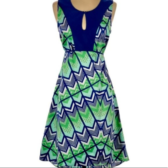 Vintage look Miss 60 dress. Mod print with solid blue inset at neckline. Fabric is silky and light. Tie waist. Inverted pleat in back. Keyhole neckline. Asymmetrical hem. Sleeveless. At or above the knee on most. Blue, green, white.