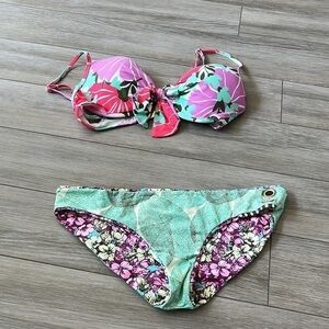 Maaji reversible bikini bottoms. Gorgeous floral print in pinks, purples, yellow and turquoise. Other side has leaf print in pale yellow, bronze and minty jade green.