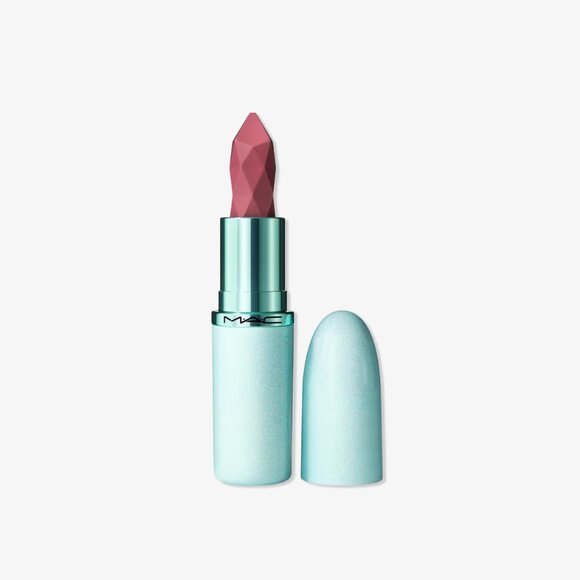 sparkly packaged lipstick with geometric shaping. hydrating shine. limited edition for MAC holiday 2025.