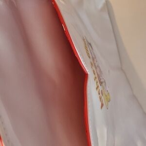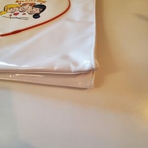 from Mac cosmetics Archie line. White faux Patent tote is new, with wrap still on handles. It may have some marks or impressions from storage.