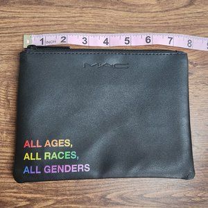 New in package, never used. MAC Cosmetics pride makeup bag, featuring MAC logo on bag and zipper, rainbow material inside.