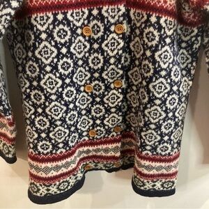 MAC & JAC Sz M 100% Wool Fair Isle Style Wooden Buttons Double Breasted Cardigan. Similar to the Dale of Norway aesthetic. Lovely and warm.