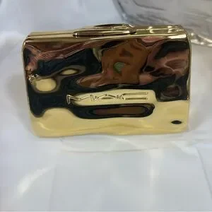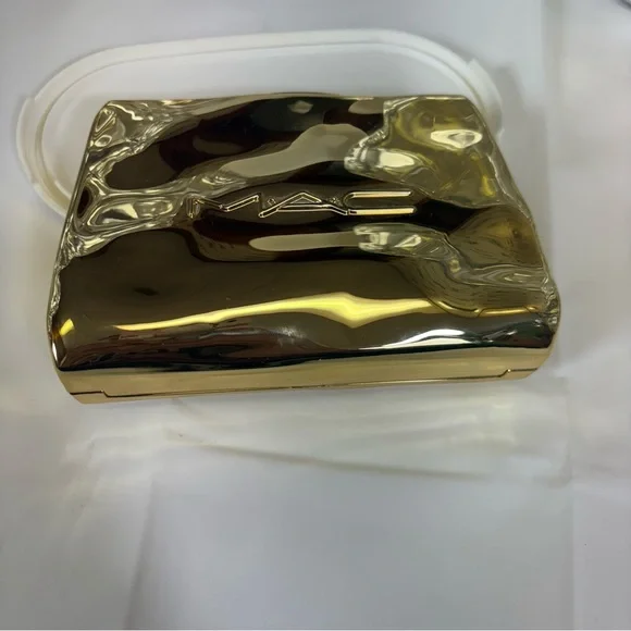 Sleek metallic compact case with a textured, wavy top. Features the MAC logo on the lid. Polished gold finish with a high-shine surface. Stylish and modern design.