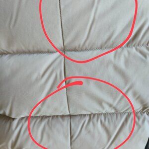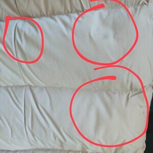 Purchased in 2020 and lightly worn (as I have a large coat collection) this is a super warm coat and is still in amazing condition. From time to time the light tan colour does require some wiping with soap and water as stains can build up and become visible. The current coat has some staining that I have not been able to remove myself and would require a professional dry cleaning service. The item is listed for way below what is worth keeping in mind that the buyer will need to have it cleaned. Photos of the staining has been added and circled - the stains in real life are quite faint but I would recommend the cleaning for the item to look brand new!