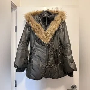 Super cute MACKAGE jacket. Size small. Has a few little nicks to it but otherwise fabulous. Authentic fur trim. Polyester filled. A statement piece!