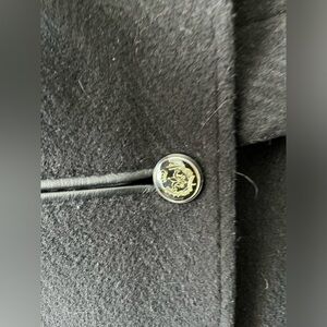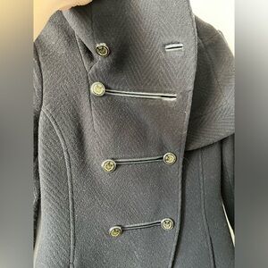 Tulip hem Wool - poly blend Military button style No hood Approximate measurements 34.5” length from shoulder to end the long hem end 16.5” pit to pit