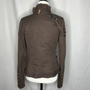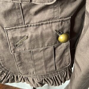 Absolutely stunning blazer jacket with ruffle. ha a small button closure just below chest level.
