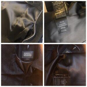 Hidden pocket inside lining, stand-up button high collar. Leather trim pockets.