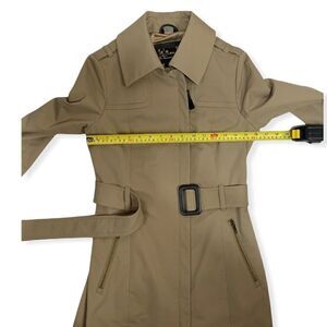 Gorgeous tan Trenchcoat by Mackage. Belted. Zippered pockets. Leather accents. Size small. Tailored. Very good condition with minor wear. See photos for condition and measurements.