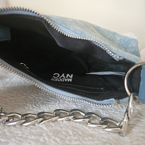 This adorable light blue mini purse has a denim texture with silver chain detailing. The blue shoulder strap is optional and can be worn with or without.