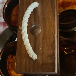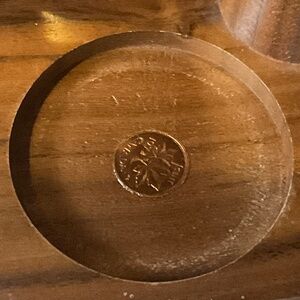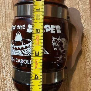 VINTAGE ‘’ MADE IN CANADA ‘’ GLASS MUG SET OF FOUR . SHOWS IN PIC ROUGHLY 5 INCHES HIGH WITH WOODEN CARVED HANDLES HELD BY METAL STRAPS UNTARNISHED . EACH SECTION IN WOODEN CARRY CASE HAS A CANADIAN PENNY 1972 .. INSET INTO BOTTOM , TOTALLY CLEAN UNSCRATCHED .. NEVER USED , THE ONE MUG HAS WHITE PRINTING ON IT ‘’’ ‘’’ SOUTH OF THE BORDER ‘’’ WITH SIMBRERO AND BLANKET .. UNDER THAT ‘’’ SOUTH CAROLINA ‘’’ The TOP OF THE WOODEN CARRY CASE HAS A ROPE TO CARRY .. ALL IN PERFEFT CONDITION ..