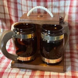 MADE IN CANADA VINTAGE GLASS MUG SET WITH WOODEN CARRY
