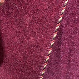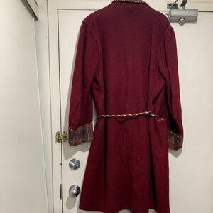 Vintage Unisex Rode Jacket, Midweight, Missing Label Tag, Fit Size L, Color Burgundy, Collar, Sleeve Cuff Red Plaid, Multicolor Trim, Wool Textured, Breast Pocket, Front Pockets, Closure: Tie Strings, Fair Condition, Front Small Spots, Sleeve, and Back Small Patches, Sleeve, Shoulder Faded, Thick Warm Wool Robe Jacket,, Made in England, Great Look, Great Fit.