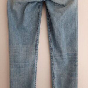 • High rise skinny leg ankle denim pants in light blue wash with fade and whisker details. Style g5391.