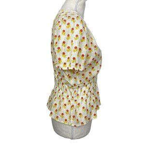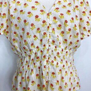 MADEWELL SOPHIA IVORY WHITE FLORAL GAUZE TOP IN WILD CALENDULA BLOCK PRINT, Block-printed by hand for a one-of-a-kind look, this pretty peplum top has an elastic waist for a shape that looks good on basically everyone. With bubble sleeves and dainty buttons down the front, it's a new addition to our best-selling Sophia fam. Please note: Due to the nature of hand blocking, small variations in the print are to be expected and celebrated. - Cropped fit. Cute modest peasant contemporary top with a convenient extensible waistline - v-neckline and button front detail - gauzy fabric - short in lenght / summer / vacation / trip / travel sunny weather favorite with jeans, denim shorts or maxi skirt.