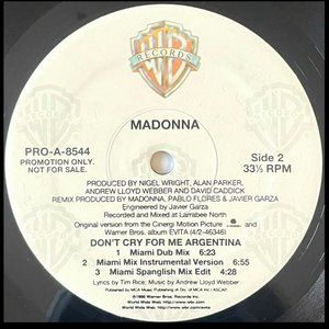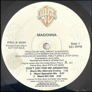 In '96, American singer Madonna starred in the title role of the film adaptation of the musical, Evita & released her version of Don't Cry for Me Argentina from the film soundtrack. It received acclaim from critics who praised her vocal performance. A separate released version called the "Miami Mix", included re-recorded vocals in English & Spanish & an Argentinean bandoneon in the song's intro. This Promotional Edition was sent to club & radio station DJs in Dec '96 for club & radio play & was officially released as a single in Feb '97. The original version reached #1 in France, Spain & the European Hot 100 Singles, while the remix hit #1 on the USA Dance Club Songs Chart & the Top 10 on the USA Hot 100 & internationally.