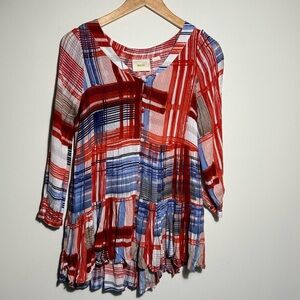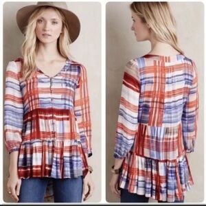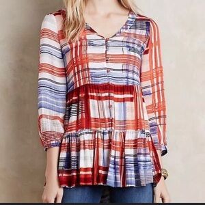 MAEVE ANTHROPOLOGIE RED BLUE PLAID FLOWY 3/4 Sleeve Blouse TUNIC TOP XS EUC
