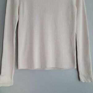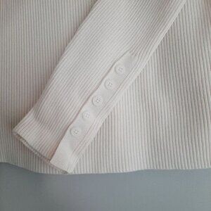 • Long sleeve fitted fine knit pullover t-neck sweater top in ivory white with fine ribbed texture and button detail at the sleeve ends.