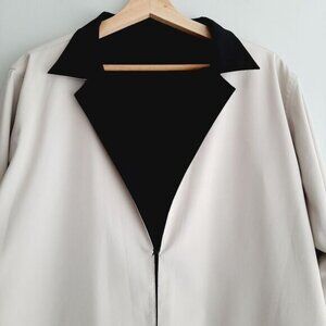 • Fun reversible, single eye/hook front closure reversible jacket in black on one and light creamy beige on the other side.