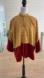 Gold brocade and rust colour velvet colour block lined jacket. Kimono sleeves, mandarin collar, small side slits and three frog closures down the front. Missing material tag, however this feels like silk and velvet. Designed and made by Maggie Walt, an Edmonton designer.