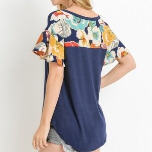 PRETTY FLORAL V NECK TOP WITH FLOWY SHEER FLORARED SLEEVES AND SHEER INSERT IN BACK NECKLINE