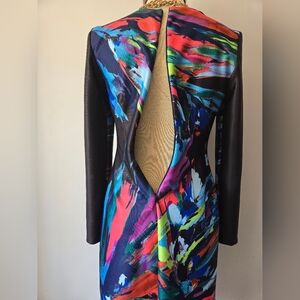 Absolutely gorgeous, vibrant midi dress with a black base and multicolor abstract paint strokes. The fading to black on the sides gives a flattering waistline.