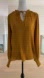 Maison d"Amelie gold yellow tie neck pullover blouse. Ruffle around neckline, unique ruched shoulder detail and smocked elastic cuffs. Relaxed fit. Textured fabric. 100% polyester.