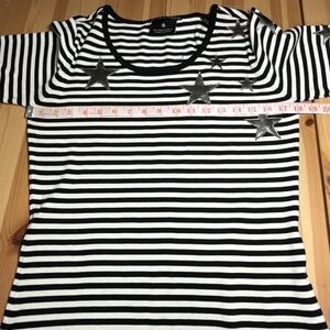 In very good pre owned condition. Silver faux leather appliqué stars on bodice going around to the back. Easy pull on style. Scoop neck. Photos are important so please check all for condition, detail and measurements.
