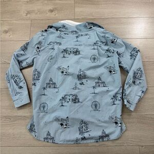 Collar, off-shoulder, long sleeves, buttoned cuffs, non-functioning button trims at front, pearlescent buttons, all-over stripe pattern, all-over graphic pattern, side split hem, dipped hem at bac: jersey vest underlay, ribbed trims at underlay