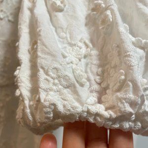 Daisies dapple this white cotton dress styled with puffed sleeves and covered buttons, for a whimsical take on absolute enchantment.