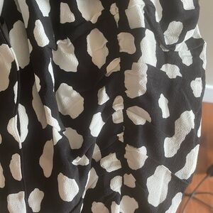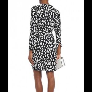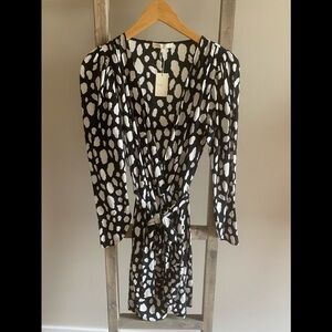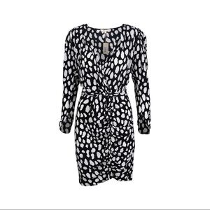 Nwt Robe Imprime Dress from Maje is designed with white abstract dotted prints all over featuring a v-neckline, long sleeves, a self-tie belt on the waist, concealed zip closure on the side and ruched skirt detail. 1 flaw noted. 1 small hole is noted beside the tag where a price tag was punched through, see photo for flaw.Material: 100% Viscose. Size 1 maje which is a USA 0-2.