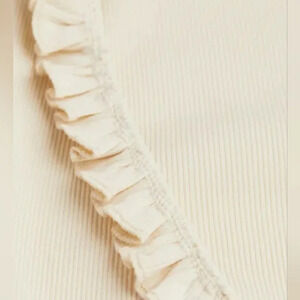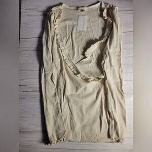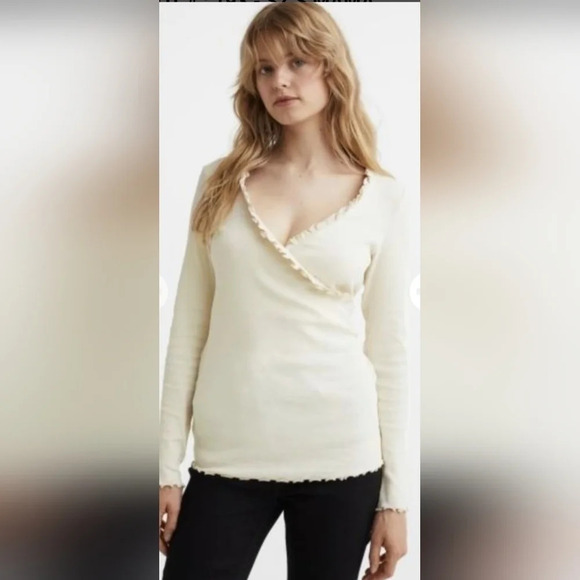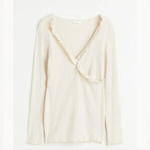 Long-sleeved top in soft cotton jersey. V-neck, wrapover front with ruffle trim, and a practical inner top for easier nursing access. For wear during pregnancy and when nursing.