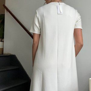 Unclosed. Elastic. Evasé design. Without inner lining. Straight design. Long design. Flared hem. Rounded neck. Short sleeve.