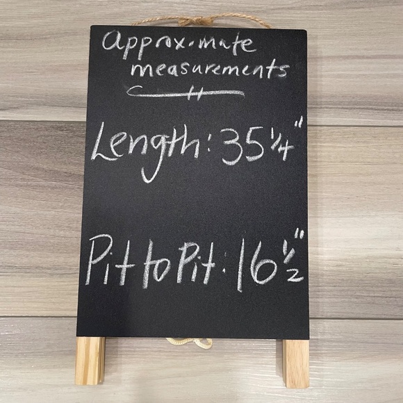 Approximate measurements, laid flat: 35.25" length / 16.5" pit to pit.