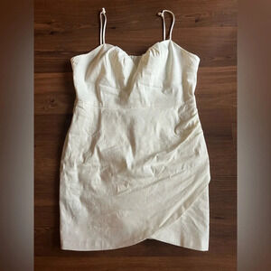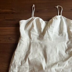 Linen mix. Tailored dress. Short design. Crew neck. Thin straps. Pleats detail. Gathered detail. Inner lining. Zip fastening on the back section. Party and events collection.