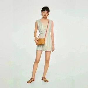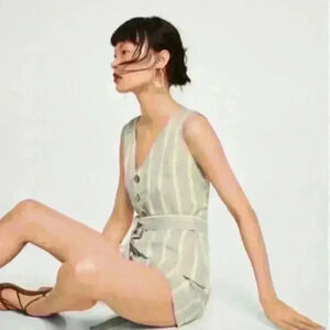 MANGO Striped Linen Jumpsuit Gray White Belted Romper Pockets Sleeveless Size M