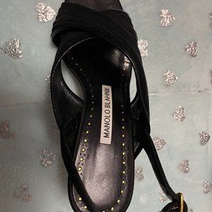 A pair of classic MANOLO BLAHNIKs in black with a medium to high stiletto heel with a criss-cross chiffon tie across the foot and a black ankle strap...brand-new in box and never worn.