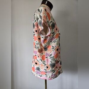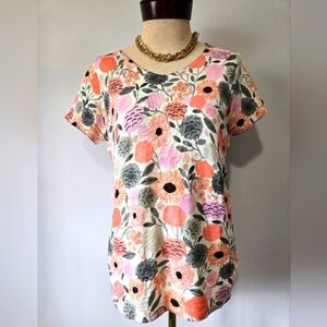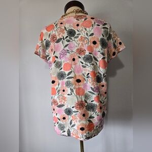 This short sleeve floral print top features a blend of pink, orange, and green hues. Comfortable cotton.