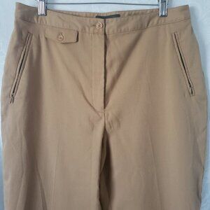 Lovely lightweight ladies pants. Two zippered side pockets at side front and small pocket with button on one side front. Gold, light brown color. Size 14
