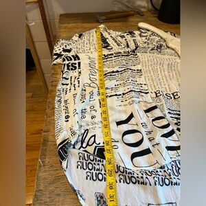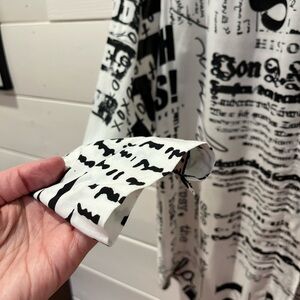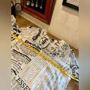 Bold statement blouse by Marc Aurel featuring an eye-catching black and white all-over newspaper and graffiti-style text print. Button front with Mandarin collar, lightweight flowy fabric, and gathered details at the shoulders and back. Size 42 Excellent condition.