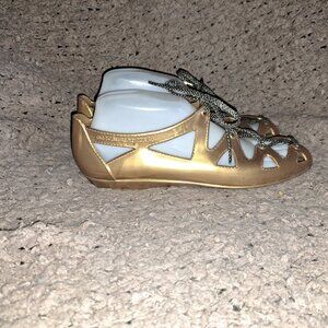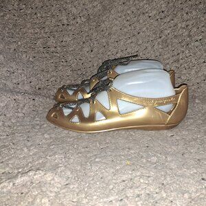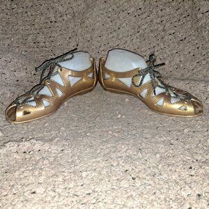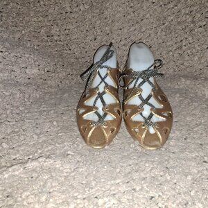 These lace-up sandals feature a solid gold color with cut-outs accents, a flat heel, and are made of rubber.