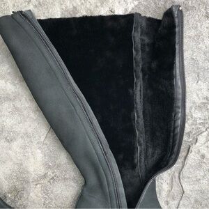 A short boot by Marc Cain in a sued black color. The sole has one zip edge. The boot has a pointed toe and the inside is lined with fur .
