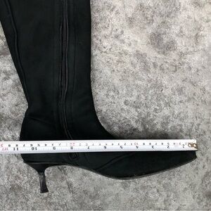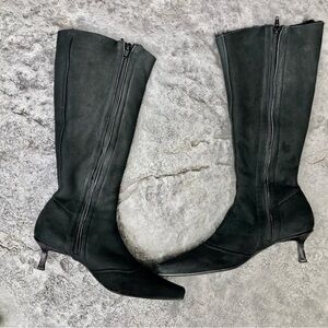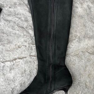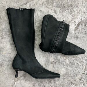 A short boot by Marc Cain in a sued black color. The sole has one zip edge. The boot has a pointed toe and the inside is lined with fur .