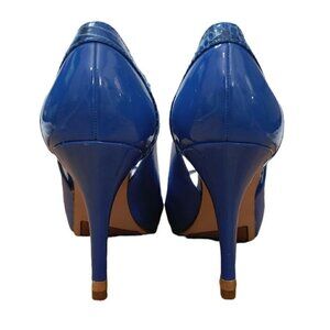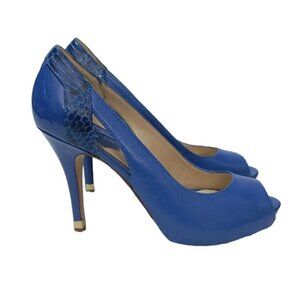 MARC FISHER Blue, leather upper, balance man made, golden details, peep toe, pumps, size 5. Great pre-loved condition, no flaws, seems like they were never worn.