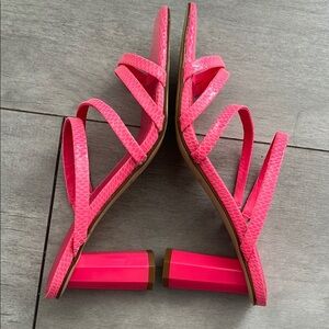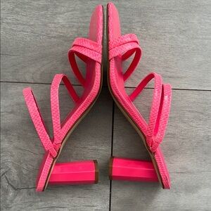 A stylish and elegant strappy sandal with a 2.5” solid heel. Colorful pink coral color. I wore these only once and so the heel is new. The straps are super comfortable with elastic for flexibility. The perfect slip on heel with jeans or a cute dress for nighttime. Size 7.5