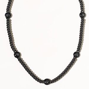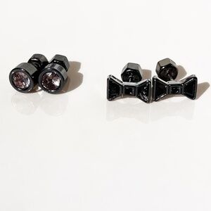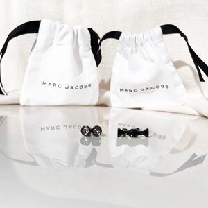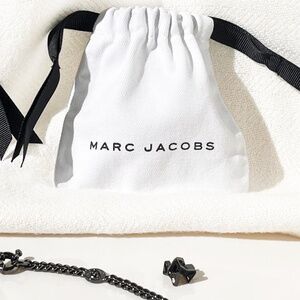 MARC JACOBS Turn-Lock Station Necklace & 2 Stud Earrings. Gorgeous turn-lock motif with signature logo emblem in a shiny jet black plated finish. Features engraved designer stamp and spring-ring closure details. Comes with 2 stunning studs; flirty and feminine skinny bow studs.and light pink crystal circle studs with post back closure, completes the look for day or night .
