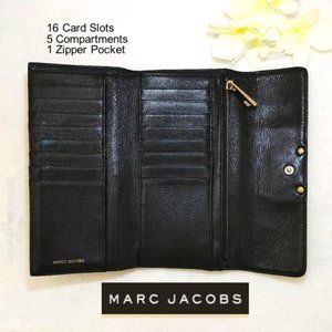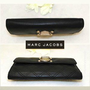 Marc Jacobs Quilted Genuine Leather Trifold Wallet. 16 credit card slots, 5 slip pockets, 1 zipper coin pocket, Buckle Snap Button Closure detailing. Silver & Gold-tone accents - gently used.