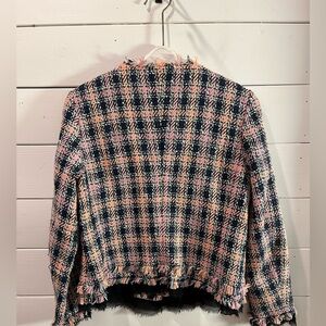 Chic and modern checked jacket by Marc Cain, in shades of navy, pink, and peach. Features raw-edge fringe details, a structured cut, and a floral patch accent for a unique touch. Fully lined, lightweight yet polished, perfect for both workwear and casual styling.